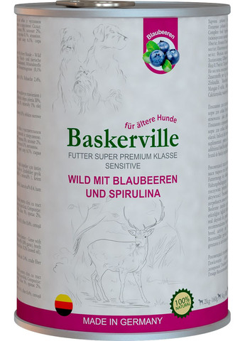 Консервы Baskerville создавались в сотрудничестве с врачами-ветеринарами и кинологами заводчиками, поэтому мы с уверенностью можем утверждать, что наш корм подходит для домашних, активных и охотничьих собак. Сбалансированный набор витаминов и минеральных веществ, находящихся в консерве, сделают вашу собаку сильной и здоровой. Фармакологические свойства Корм "Baskerville" обеспечивает организм животного необходимым количеством питательных веществ, витаминов и микроэлементов, что способствует активизации обмена веществ, улучшению аппетита, роста и развития волосяного покрова. Применение немецкого корма Baskerville Как основной и полнорационный корм. Совместим в использовании с другими кормами при соответственным образом сбалансированном рационе. Состав компонентов, вспомогательных веществ: Мясо оленины 30% мясные субпродукты 35%; черника 3%, минералы 1%, бульон 0,3%, льняное масло 0,2%, спирулина 0,1%, витамины. Сырой протеин 10,80%; Сырой жир 6,10%; Сырая зола 2,40%; Сырая клетчатка 0,40%; Влажность 77%; Витамин D3 200 МЕ (международных единиц) / кг, витамин Е 20 МЕ / кг Витамин В1 10 мг / кг; Витамин В2 6 мг / кг Витамин В6 2 мг / кг; Витамин В12 75мкг / кг Никотиновая кислота 15 мг / кг; Пантотеновая кислота 9 мг / кг Фолиевая кислота 0,35мг / кг Биотин 300 мкг / кг; Холинхлорид 1200 мг / кг; Цинк 25 мг / кг; Марганец 1,4мг / кг Йод 0,75мг / кг. Не содержит консервантов, красителей и синтетических добавок.