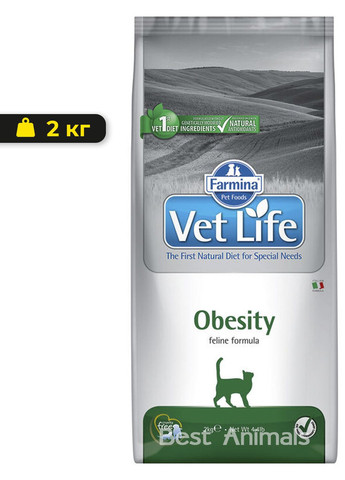 Vet Life Obesity Cat – диетическое питание для кошек, разработанное для снижения лишнего веса. Показания: контроль веса; Избыточный вес; Ожирение. Преимущества сухого диетического корма Vet Life Obesity Cat: Правильное содержание растворимой и нерастворимой клетчатки способствует ощущению сытости; Низкая калорийность поддерживает уменьшение лишней массы тела; Сниженное содержание жиров приводит к более низкой калорийности диеты; Правильное развитие мышечной массы поддерживается благодаря высоким уровням белка с высокой биологической ценностью и добавлению L-карнитина (эффективно для мышечного энергетического метаболизма) и таурина (мышечная сократимость); Исключительное использование анцестральных злаков, таких как полба и овес обеспечивает формулу с низким гликемическим индексом. Механизм действия Farmina Vet Life Obesity ограничивает количество потребляемых калорий и способствует снижению веса. Повышенное содержание пищевых волокон вызывает чувство сытости и снижает аппетит. Низкий уровень и высокое качество источников крахмала и сахара позволяет использовать диету в терапии пациентов страдающих сахарным диабетом. Рецептура диеты содержит карнитин, стимулирующий окисление жиров и высококачественные белки, что позволяет избежать снижения мышечной массы в процессе похудения. Ингредиенты: Дегидратированные белки птицы (курица, индейка), кукурузный глютен, волокна гороха, овес, гидролизат белка рыбы, спельта, дегидратированный рыбный белок, куриный жир, дегидратированные яйца, рыбий жир, пульпа сахарной свеклы, льняное жвачных животных (ягненок, говядина), дегидратированный свиной белок, хлорид калия, инулин, фруктоолигосахариды, дрожжевой экстракт (источник манноолигосахаридов), подорожник, хлорид натрия, сульфат кальция дигидрат, хондроитина. Аналитический состав: Сырой белок 43%; Сырой жир и масла 9%; Сырая клетчатка 10%; Сырая зола 7,5%; Кальций 1,1%; фосфор 0,95%; Натрий 0,45%; калий 0,8%; магний 0,08%; Омега-3 0,45%; Омега-6 1,6%; EPA 0,1%; DHA – 0,15%. Добавки на 1 кг: Витамин А 15000 МЕ; Витамин D3 1000 МЕ; Витамин Е 550 мг; Витамин С 250 мг; Ниацин 125 мг; D-кальция пантотенат 42 мг; Витамин В2 17 мг; Витамин В6 7 мг; Витамин В1 8 мг; Биотин 1,3 мг; Фолиевая кислота 1,3 мг; Витамин В12 0,08 мг; Холина хлорид 2500 мг; Бета-каротин 1,5 мг; Цинк (хелат цинка гидрокси-аналога метионина) 130,5 мг; Марганец (хелат марганца гидрокси-аналога метионина) 65,5 мг; Железо (железо (II) хелат гидрата глицина) 43,1 мг; Медь (хелат меди гидрокси-аналога метионина) 10,8 мг; Селен (селенизированные дрожжи инактивированы) 0,132 мг; Йодат кальция безводный 1,56 мг; DL-метионин 3500 мг; Таурин 2500 мг; L-лизин-моногидрохлорид, технически чистый 4000 мг; L-карнитин 550 мг. Специальные добавки: микрокристаллическая целлюлоза. Антиоксиданты : экстракт токоферолов натурального происхождения 10 мг. Энергетическая ценность: 3369 ккал/кг.