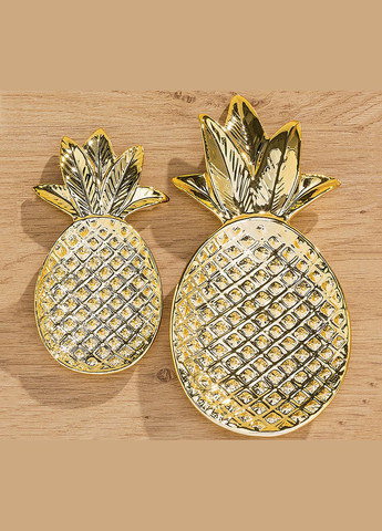Оригинальная посуда для вашего интерьера – небольшие тарелочки (размерами от 13 до 19см) в форме ананаса. Подойдет и для праздничного стола, и как декор. Идеальный вариант подарка коллеге или подруге на день рождения (Новый Год). Производят из керамики, глянцевого золотого цвета. Эти тарелочки можно использовать для оливок, орешков или сыра. Количество в упаковке 2 шт. Количество в ящике 2 шт.