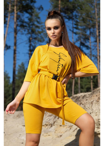 Стильный яркий образ с этой моделью спортивного молодежного костюма с велосипедками из новой коллекция Free style будет точно обеспечен. Броский горчичный оттенок в дополнении эксклюзивной вышивки черного цвета на футболке и текстильного съемного пояса с необычной пряжкой то, что нужно для повседневного, городского или спортивного стиля. Модель состоит из укороченных леггинсов с высокой посадкой и футболки с короткими приспущенными рукавами в стиле оверсайз. Для пошива спортивного костюма была использована легкая воздухопроницаемая ткань отменного качества летняя двунитка. Длина изделия: S=72 см, M=72 см, L=72 см, XL=72 см