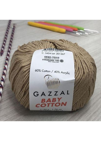 Состав (материал) 60% Хлопок, 40% Акрил Вес мотка 50 g Метраж на этикетке 160 m Соответствующие спицы: № 3 – 5 Соответствующий крючок: № 2 – 4 Расчет петель 10×10 cm …. 28 рядов 24 петли Количество мотков в упаковке 10 Gazzal «Baby Cotton». Вес мотка – 50 г. Метраж – 165 м. Состав хлопок 60%, полиакрил 40%. Естественность и практичность доведены до идеала. Использовать эти ниточки можно практически для любых демисезонных и летних изделий, игрушек, детских вещей, пледов и т.д. Пряжа для вязания Газал Бэби Котон очень послушная и упругая, практически без ворса с легким блеском. На ощупь мягкая, отлично подходит для спиц и крючка.