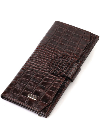 Материал: натуральная кожа; Размеры (ШхВ, см): 9х18,8х1 см; Цвет: коричневый; Страна производитель: Турция. Описание: - основное отделение для купюр; - 11 карманов для карточек; - карман под сеточкой для пропуска; - два скрытых кармана; - закрывается хлястиком на кнопку; - кошелек упакован в фирменную коробочку. Удобный мужской кошелек из натуральной фактурной кожи с тиснением под крокодила. Аксессуар имеет одно основное отделение для купюр всех номиналов, одиннадцать ячеек для карточек, карман под сеточкой для пропуска и два скрытых кармана. Закрывается аксессуар пополам хлястиком на кнопку. На лицевой стороне, в правом нижнем углу металлический логотип компании производителя. Приобретая кожаный аксессуар этой фирмы, себе или на подарок, будьте уверены, что он прослужит Вам не один год.