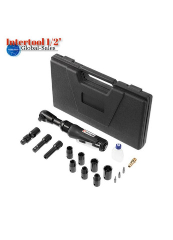 Гайковерт пневматический инструмент профессионального типа, который широко используется в автомастерских, на производстве и при выполнении монтажных работ с применением крепежных элементов с различным профилем. Идеально подходит для шиномонтажа, а также ремонта грузовых автомобилей и техники. Данный гайковерт имеет ударный механизм и функцию реверса. Комплектуется набором головок размерами: 9, 10, 11, 13, 14, 17, 19, 22, 24 и 27 мм. Также в комплект поставки входят шестигранный ключ, лубрикатор и удлинитель. Все это укомплектовано в удобный кейс. Скорость вращения составляет 7000 об/мин, а максимальное усилие - 345 Нм. Рабочее давление может достигать 6 атм. Рукоятка прибора прорезинена. Количество единиц в наборе: 17 ед.; Рабочее давление: до 6 атм; Максимальное усилие: 345 Нм; Квадрат: 1/2"; Скорость вращения: 7000 об/мин; Наличие реверса: да; Расход воздуха: 260 л/мин; Диаметр шланга: 8-10 мм; Покрытие рукоятки: резина