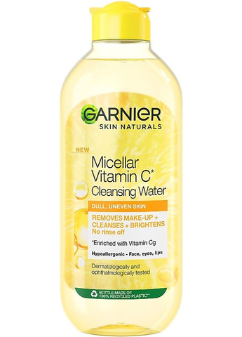 Нежное и эффективное очищающее средство – это мицеллярная вода с витамином С от Garnier. Вам не нужно будет иметь дополнительные продукты для демакияжа, если вы будете использовать ее. Это средство увлажняет и освежает эпидермис, готовит его к дальнейшему уходу. Благодаря мицеллярной технологии, которая обеспечивает глубокую очистку пор и поверхности кожного покрова, Garnier Skin Naturals Vitamin C Micellar Cleansing Water эффективно удаляет загрязнение и макияж даже с губ и глаз. Особенности мицеллярной воды Skin Naturals Vitamin C от бренда Garnier:- содержит витамин С; агрессивных веществ, которые могут раздражать эпидермис; – подходит для всех типов кожи, в том числе для чувствительной; – имеет приятный аромат и легкую консистенцию, не оставляющую жирных следов; – подходит для ежедневного использования.