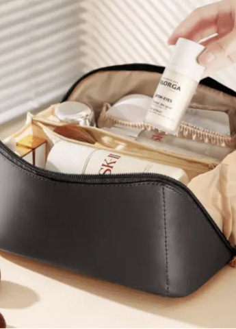 Сумка для косметики женская из экокожи Баунти LEOSOXS черного цвета. Женская трендовая сумка косметичка из экокожи в дорогу, для путешествий и домашнего использования. Добавит вашей ванной стиля и элегантности, а своей уникальной и очень удобной формой позволит видеть все ваши средства как на ладони, вы заблудите о том, что нужно рыться и выискивать нужный крем.