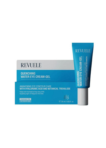 Увлажняющий крем для кожи вокруг глаз Revuele Quenching Water Eye-Cream Gel с гиалуроновой кислотой, растительными трегалозами, витамином Е Легкая и увлажняющая текстура крема для контура глаз превратилась в нежный крем-гель, обладающий суперувлажняющими свойствами. Средство ухаживает за нежной кожей век, насыщает клетки влагой, разглаживает морщины, вызванные обезвоженностью, возвращает эпидермису упругость, гладкость, сияние молодости. Эта формула с повышенным уровнем увлажнения идеально подходит для нормальной, сухой кожи, обезвоженной кожи век. Активные компоненты крема-геля для кожи вокруг глаз: гиалуроновая кислота - увлажняет и разглаживает кожу век, уменьшая темные круги и морщины; растительные трегалозы - защищают кожу век от обезвоживания и окислительного стресса, повышая ее упругость, обладают антиоксидантными и защитными свойствами; витамин Е – мощный антиоксидант, который нейтрализует свободные радикалы, разглаживает морщины и осветляет темные круги под глазами. Способ применения: нанесите крем-гель на очищенную кожу вокруг глаз после очищения. Используйте утром и вечером. Объем: 25 мл