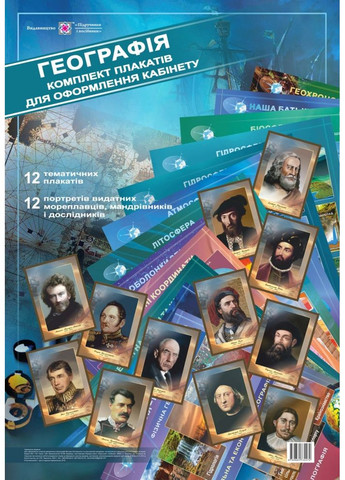 Автор(ы) Хихловский В. Страниц 12 Формат А3 (300*420 мм), А2 (420*600 мм) Обложка картон, мягкая Год 2019 Список плакатов: Таблицы: 1. География – наука о земле: физическая география, социальная и экономическая география, картография и топография 2. Большие географические открытия 3. Земля на плане и на карте: масштаб, классификация карт в зависимости от масштаба, способы картографического изображения 4. Географические координаты 5. Литосфера: внутреннее строение земли, горные породы и минералы6. Литосфера: литосферные плиты, движения литосферных плит 7. Атмосфера 8. Гидросфера: состав гидросферы, океаны 9. Гидросфера: схема речной системы, величайшие озера мира, образование озерных угловин 10. Биосфера 11. Наша родина – Украина 12. Геохронологическая таблица на территории Украины Портреты: 1. Клавдий Птолемей 2. Америго Веспуччи 3. Марк Поло 4. Бартоломей Диаш 5. Фернан Фонтан 6. Абель Тасман 7. гладефор Колумб 8. Николай Миклухо-Маклай 9. Иван Крузенштерн 10. Фадей Беллинсгаузен 11. Николай Пржевальский 12. Руаль Амундсен