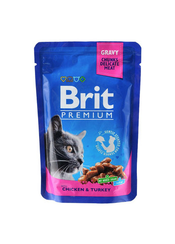 Пауч с курицей и индейкой для кошек - это полностью сбалансированный полнорационный влажный корм, применение которого обеспечит вашего питомца полезными веществами, витаминами и минералами. Аппетитные сочные кусочки в нежном соусе легко усваиваются и не вызывают аллергических реакций, поскольку корм не содержит в своем составе искусственных красящих веществ, ароматизаторов, усилителей вкуса, сои, кукурузы. Витаминно-минеральный комплекс, входящий в состав корма, оказывает благоприятное действие на нервную систему, состояние кожного покрова и шерсти. Кроме того, в состав корма входит инулин, который является натуральным пребиотиком. Инулин добывают из растений таких, как георгины, одуванчики, топинамбуры, цикорий и при регулярном использовании он оказывает благоприятное действие на микрофлору кишечника и укрепляет иммунитет. С его применением всасывание магния и кальция в толстой кишке, принимающих участие в формировании костного скелета, усиливается. Состав: Мясо и мясопродукты 78% (курица - 8%, индейка - 8%), продукты растительного происхождения (инулин - 0,4%), минеральные вещества. Не содержит красителей и консервантов. Аналитический состав: Сырой протеин 8,5% Сырой жир 4,5% Сырая зола 2,5% Сырая клетчатка 1% Влажность 82% Пищевые добавки: Витамин D3 250 МЕ/кг Цинк 10 мг/кг Витамин Е (альфа-токоферолацетат) 100 мг/кг Медь (сульфат меди ll, пентагидрат) 0,2 мг/кг Марганец (сульфат марганца ll, моногидрат) 2 мг/кг Биотин 0,1 мг/кг Таурин 450 мг/кг Рекомендации по кормлению: Вес кошки Суточная норма корма, пакетика/день 2 кг 1,5 пак. 4 кг 3 пак. 6 кг 4 пак. 8 кг 5 пак. Производитель: Brit, Vafo Praha s.r.o., Чехия