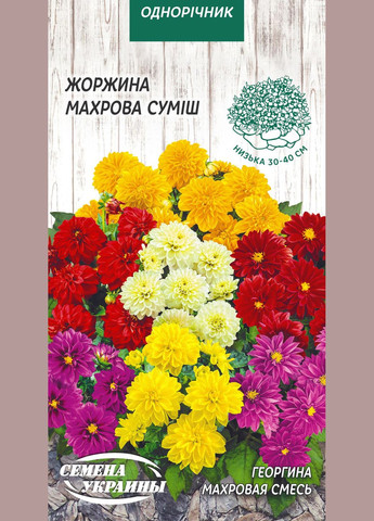 Георгина Махрова (смесь) [0,2г] Однолетнее растение с ветвистыми стеблями, высотой 30-40см. Цветки махровые, крупные, диаметром 6-9см, разнообразных ярких расцветок. Используется для оформления бордюров, клумбы, балконных ящиков и садовых ваз.