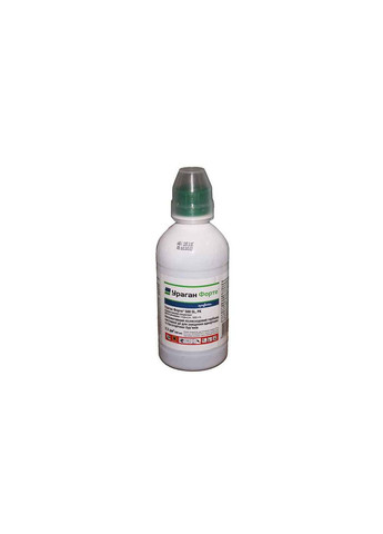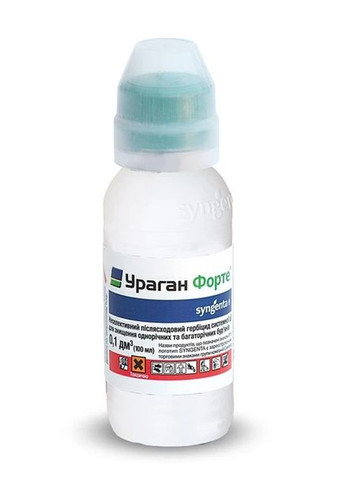 Ураган Форте 100 мл - неселективный послевсходовый гербицид системного действия, которым успешно уничтожают однолетние и многолетние сорняки. Применяется на с/х площади предназначенной для посева или посадки овощей, картофеля, виноградниках и садах. Действующее вещество: глифосат - 500 г/л Механизм действия: Ураган Форте попадая на сорняки, быстро всасывается и проникает через листья в корневую систему. Первые признаки гибели сорняков наступают уже через 3-5 дней, а полное их уничтожение через 10-14 дней после применения. Растения постепенно желтеют, буреют и отмирают. Срок действия зависит от погодных условий и вида сорняков. Преимущества: - Обладает быстрым и полным проникновением в сорняки растений и их корневища. - Оказывает лучшее действие в холодных и засушливых условиях. - Сокращает период ожидания от внесения до проведения других технологических операций. - Уничтожает опасные виды сорняков (осота, березки, пырея и др.) - Имеет низкую норму внесения. - Сорняки обработанные препаратом не отрастают. Опрыскивание проводят свежеприготовленным раствором в безветренную сухую погоду, при температуре не ниже 15 градусов. Обработку не следует проводить, если за 2-3 часа ожидается дождь. Наилучший эффект при применении препарата достигается во время активного роста сорняков в теплую погоду (100 мл препарата можно обработать 2,5-5 соток).