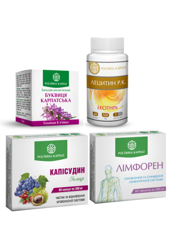 Комплексная программа лечения Рослина Карпат — это эффективный и безопасный способ борьбы с варикозом. Она состоит из четырёх растительных препаратов, которые помогают укрепить венозные стенки, улучшить кровоток, уменьшить воспаление и отёчность, а также улучшить общее состояние организма. * Бальзам Буквица Карпатская — средство, содержащее экстракт буквицы карпатской, обладающий противовоспалительным, антиоксидантным, обезболивающим и ранозаживляющим действием. Бальзам применяется наружно для массажа больных участков ног, а также для компрессов и обёртываний. * Лимфорен Рослина Карпат — препарат, содержащий экстракты лопуха, крапивы, калины, брусники, шиповника и других растений, которые способствуют нормализации лимфатической системы, выведению лишней жидкости из тканей, уменьшению отёчности и тяжести в ногах. * Каписудин Рослина Карпат — препарат с экстрактами гинкго билоба, конского каштана, арники, рутина и других веществ, улучшающих микроциркуляцию крови, снижающих вязкость крови, предотвращающих образование тромбов, укрепляющих сосудистые стенки и снимающих воспаление. * Лецитин Р.К. Рослина Карпат — препарат, содержащий лецитин, который является важным строительным материалом для клеточных мембран, а также витамины А, Е, F, группы В, минералы и аминокислоты, поддерживающие оптимальный уровень холестерина в крови, обеспечивающие антиоксидантную защиту, повышающие иммунитет и улучшающие функции печени.