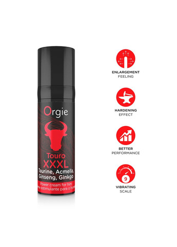 Крем для усиления эрекции и увеличения пениса TOURO XXXL, 15 мл с таурином и гингко билоба Orgie Откройте для себя новые возможности с кремом для усиления эрекции и увеличения пениса Taurino Ginkgo XXXL от Orgie. Обогащенный натуральными ингредиентами, такими как таурин, гинкго билоба и экстракт Acmela Spilanthes, этот крем поможет вам достичь сильной и уверенной эрекции, а также создаст ощущение увеличения размера пениса для усиления удовольствия. Крем Taurino Ginkgo XXXL содержит уникальную формулу, в которой активные компоненты обеспечивают эффективное действие. Таурин и гинкго билоба способствуют сосудорасширению, улучшая приток крови к пенису, что в свою очередь усиливает эрекцию. В композиции крема также присутствует экстракт корня женьшеня, известный своим афродизиакальным свойствами. Применение крема просто: нанесите небольшое количество средства на головку пениса и массируйте до появления возбуждающего эффекта. Подождите около 5 минут, чтобы получить ожидаемый результат. Если вам кажется, что действие крема слишком интенсивное, начните с минимальной дозы и постепенно увеличивайте ее, ориентируясь на свои ощущения. Крем Taurino Ginkgo XXXL не имеет запаха и не требует смывания перед половым актом. Благодаря косметическим компонентам, он также питает и омолаживает кожу. Упаковка содержит 15 мл крема, а срок годности составляет 6 месяцев с момента первой прокачки помпы. Характеристики: Цвет: Белый Запах: без запаха Объем: 15мл