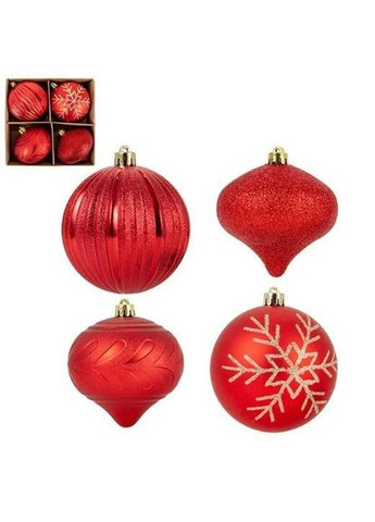 Набор пластиковых елочных шаров, цвет – красный, 4 шт. диаметром – 10 см: фигурный глянцевый – 1 шт. фигурный матовый – 1 шт. матовый с узором – 1 шт. фигурный глиттер – 1 шт. Елочные шары словно созданы для того, чтобы новогоднее настроение поселилось в вашем доме. Шарики на елку всегда будут классическим решением в праздничном декоре - они хороши не только для елки, но и в составе оригинальных зимних букетов и дизайнерских композиций. Ещё ими можно декорировать хвойную гирлянду или рождественский венок - вариантов применения существует масса.