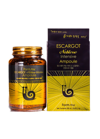 Ампульная сыворотка для лица с муцином улитка FarmStay Escargot Noblesse Intensive Ampoule Многофункциональная ампульная сыворотка для лица Escargot Noblesse Intensive Ampoule ускоряет процессы обновления и регенерации; устраняет покраснение и воспаление; способствует разглаживанию морщин и повышает упругость кожи; увлажняет и восполняет недостаток влаги в клетках эпидермиса. Средство подходит для любого типа кожи, имеет легкую гелевую консистенцию, быстро впитывается и не оставляет липкость. Три необходимых средства для ухода за дермой в одном: сыворотка, тоник и эмульсия. Благодаря активному компоненту – ферменту улиточной слизи – происходит регенерация и омоложение эпителия, повышение тургора и качественное увлажнение. После длительного применения поверхность дермы становится светлее, выравнивается тон, становятся практически незаметными последствия постакне и пигментации. В составе слизи: коллаген и эластин – играют важную роль в поддержании эластичности и тонуса кожи; аллантоин – компонент регенерирующий и способствующий восстановлению кожи; витамины А, С, Е – отвечают за увлажнение и питание кожи, защищают ее от свободных радикалов и преждевременного старения; гликолевая кислота – способствует отшелушиванию ороговевшего слоя кожи, оказывает противовоспалительное действие; антибиотики – защита кожи от воздействия вредных микроорганизмов; противосолнечный фильтр (защита от ультрафиолетового излучения). В комплекте также специальная ложечка для нанесения. На чистую, слегка влажную поверхность нанесите небольшое количество эмульсии и равномерно распределите. Избегайте контакта с глазами. Объем: 250 гр.