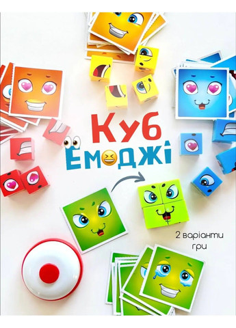 Веселая игра для всей семьи! Игра «Эмодзи куб» не только развлекает, но и способствует развитию эмоционального интеллекта ребенка. Игроки учатся распознавать и выражать эмоции. Она создаст позитивную атмосферу среди участников и гарантированно принесет улыбки на лица игроков, обеспечивая каждому незабываемые часы веселья. Способ игры 1 Рекомендуемое количество игроков: от 2 до 4. 1. Перетасуйте карточки с эмоциями и разделите их поровну между игроками. 2. Игроки выбирают 4 кубика одного цвета. 3. Каждый одновременно открывает карточку с эмоцией и быстро перемещает кубики в руках, чтобы создать эмоцию, изображенную на карточке. 4. Игрок, который быстрее всех соберет эмоцию и позвонит в колокольчик, побеждает! Если ваш ответ верный, вы выигрываете эту карточку. Если ответ неверный, игра продолжается, но вы временно выходите из игры до следующего раунда. 5. Игрок, собравший наибольшее количество карточек, становится победителем! Способ игры 2 Рекомендуемое количество игроков: от 2 до 4. 1. Перетасуйте колоду карточек и положите их в центр стола. 2. Игроки выбирают 4 кубика одного цвета. 3. Каждый игрок по очереди открывает карточку с эмоцией и как можно быстрее пытается воспроизвести ее с помощью кубиков. 4. Игрок, который быстрее всех соберет эмоцию и позвонит в колокольчик, побеждает! Если ваш ответ верный, вы выигрываете эту карточку. Если ответ неверный, игра продолжается, и вы временно выходите из игры до следующего раунда. 5. Игрок, собравший наибольшее количество карточек, становится победителем. Комплектация: - 48 карточек с эмоциями. - 16 кубиков в 4 цветах. - Колокольчик.