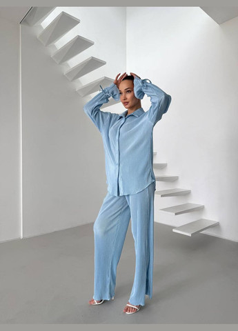 Женский костюм из ткани гофре, состоящий из свободной рубашки и шорт. Рубашка - удобного оверсайз кроя с воротником и длинными рукавами, которые можно носить как навыпуск, так и завязывать. Шорты с высокой посадкой на резинке, легкие и не сковывают движений. Ткань гофра имеет приятную фактуру, не требует глажки и прекрасно держит форму. Идеальный вариант для стильных летних образов и отдыха.
