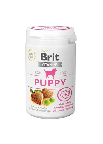 Brit Vitamins Puppy — это витаминизированный полумягкий корм для щенков, который обеспечит малыша необходимыми в период активного роста и развития витаминами и минералами. Витаминизированные лакомства защитят питомца от инфекций и помогут ему вырасти здоровым, крепким и энергичным. Каким собакам нужны витамины Брит с лактобактериями и глюкозамином? Жевательные витамины подходят для щенков всех пород в возрасте от 8 недель. Они будут особенно полезны маленьким друзьям, которые получают несбалансированное питание, подвержены стрессу или восстанавливаются после болезней и травм. Лакомства можно давать с кормом или отдельно. Преимущества Brit Vitamins Puppy: Комплекс витаминов и органических минералов способствует здоровому развитию щенков. Витамины A, C и E, а также антиоксиданты помогают укрепить иммунную систему и защищают от инфекций. Лосось и водоросли с омега-3 оказывают противовоспалительный эффект и поддерживают здоровье суставов. Юкка Мохаве обладает антибактериальными свойствами и устраняет неприятный запах из ротовой полости. Маннаноолигосахариды и инулин способствуют росту полезных бактерий в кишечнике. Lactobacillus обеспечивают парапробиотический эффект, способствуя балансу микрофлоры кишечника. В составе продукта нет зерновых, сахара, красителя, ГМО. Чтобы укрепить иммунитет и поддержать активную жизнедеятельность вашего питомца, рекомендуем купить витаминизированные лакомства для собак. Их можно добавлять к ежедневному рациону и использовать в качестве полезной вкусняшки для обучения базовым командам. Состав: Лососевый протеин (26%), гороховая мука, растительный глицерин, гидролизованная куриная печень, маннан-олигосахариды (5%), коллаген, патока, сушеный инулин (2,5%), сушеные водоросли (2%, Schizochytrium limacinum) юкка Шидигера (1,5%), фульвокислота (1%), глюкозамин (1%), хондроитин сульфат (0,5%), Lactobacillus helveticus HA – 122 инактивированных (15x109 клеток/кг(kg)). Аналитический состав: Сырой протеин 20,0%, сырой жир 4,0%, влажность 17,0%, сырая зола 7,0%, сырая клетчатка 3,0%, кальций 0,8%, фосфор 0,7%, натрий 0,6%, омега-3 жирные кислоты 1,2%, омега-6 жирные кислоты 0,4%, ЭПК (20:5 n-3) 0,2%, ДГК (22:6 n-3) 0, 5%. Питательные вещества: Сырой протеин 20,0 %, сырой жир 4,0 %, сырая зола 7,0 %, сырая клетчатка 3,0 %. Добавки в 1 кг (kg): Витамин A (3a672a) 200000 МЕ, витамин D3 (3a671) 12600 МЕ, витамин E (3a700) 4400 мг, витамин C (3a312) 5000 мг, холина хлорид (3a890) био 3a880) 4,8 мг, витамин B1 (3a821) 24 мг (mg), витамин B2 (3a825i) 30 мг (mg), ниацинамид (3a315) 120 мг, кальций D-пантотенат (3a841) 80 мг (mg), витамин B6 (3a831) 24 мг (mg), фолиевая кислота (3a316) 4 мг (mg), витамин B12 0,3 мг (mg), цинк (3b606) 665 мг (mg), железо (3b106) 580 мг (mg) , марганец (3b504) 285 мг (mg), йод (3b201) 5,2 мг (mg), медь (3b406) 100 мг (mg), селен (3b810) 1,3 мг (mg). Содержит консерванты, одобренные ЕС: лимонная кислота (1a330), DL-яблочная кислота (1a296). Энергетическая ценность: 2960 ккал/кг (kcal/kg). Рекомендации по применению: Следуйте рекомендациям по дозировке — на каждые 5 кг веса собаки 2 шт . Не перекармливайте питомца витаминизированными лакомствами. В случае случайной передозировки обратитесь за помощью к ветеринару. Продукт используется как функциональное лакомство для здорового роста щенков. Не подходит для замены полноценного рациона. Проследите за тем, чтобы у собаки всегда был доступ к свежей питьевой воде. Условия хранения: Хранить в сухом темном месте, при температуре от 2 до 25 градусов. Фасовка: 150 г