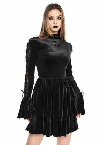 Мини-платье – Gothic Velvet Contrast Lace. Это платье в готическом стиле с бархатом и контрастными кружевными деталями. Оно имеет облегающий крой и подол в форме русалки. Платье включает в себя подол с оборкой и расклешенные рукава. Ткань средней эластичности. Оно имеет высокую талию и плиссированный подол.