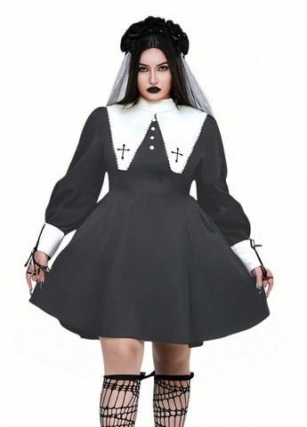 Это платье имеет темный панк-дизайн для косплея на Хэллоуин. Это платье А-силуэта с длинными рукавами и высокой талией. Стиль включает в себя готические элементы и контрастные цвета. Оно включает воротник-стойку и жемчужную отделку. Платье имеет расклешенный подол и застежку на пуговицы спереди. Ткань не тянется.