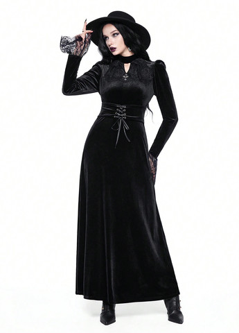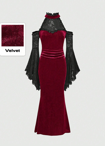Это платье в готическом стиле с кружевом и бархатным лоскутным узором. Подходит для вечеринок, Хэллоуина или празднования Нового года. Платье имеет облегающий крой и высокую талию. Оно включает вырезы, шнуровку и застежку-молнию. Платье имеет рукава-фонарики и расклешенный подол. Ткань сильно тянется.