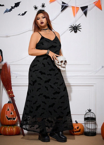 SHEIN EZwear Plus Size Женское черное сетчатое платье на Хэллоуин, одежда на Хэллоуин, изгиб на Хэллоуин, готический принт летучей мыши, ведьминский стиль.