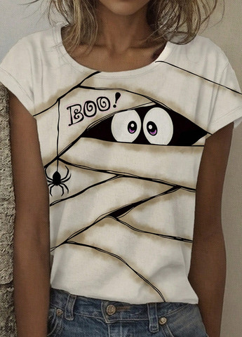 Эта свободная футболка с принтом на тему Хэллоуина. Имеет рукава с заниженной линией плеч и круглый вырез. Ткань средней эластичности с обычным подолом.