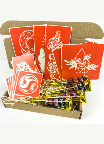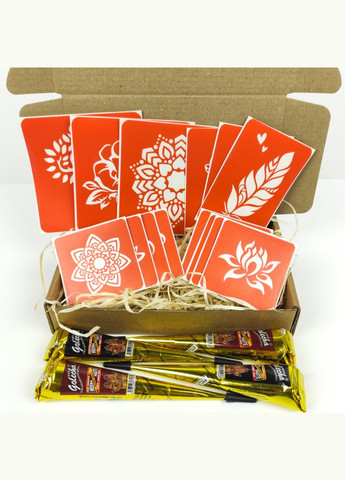 Набор хны с трафаретами для биотату №1 от Fresh Tattoo содержит: хну в конусе черную - 2 штуки; хну в конусе коричневую - 2 штуки; трафарет для нанесения, 6*6 см - 4 шт; трафарет для нанесения, 6*10 см - 2 шт. Вес хны в каждом конусе: 25 г. Почему именно хна в конусе ТМ "Golecha": единственная сертифицированная хна; одобрена МОЗ Украины; рисунок остается на коже до 7 дней; вымывается равномерно. Применение хны для био-тату: Сделать тест на аллергию! Нанести на тело толстым слоем (для удобства можно использовать трафарет); через 20 минут удалить сухую хну. Кокосовое масло с эвкалиптом для закрепления тату хной. После снятия хны необходимо нанести масло для закрепления рисунка и яркости цвета. Только для наружного применения! Как сделать био-тату хной: выберите равномерный участок кожи; хорошо обезжирьте его; снимите с трафарета белую подложку (бумажная основа трафарета); приклейте трафарет на сухую и обезжиренную кожу; акуратно снимите прозрачную пленку и убедитесь, что трафарет (оранжевая часть) плотно приклеен к коже; Нанести через трафарет на тело хну толстым слоем; через 20 минут удалить сухую хну. Для чего нужен трафарет: если не умеете рисовать от руки; если нужно много и быстро рисовать; нужно создавать одинаковые и по размеру, и по внешнему виду рисунки - воспользуйтесь трафаретами Fresh Tattoo; трафареты Fresh Tattoo безопасны для кожи и подходят ля нанесения временных тату всех типов: глиттер-тату, хной, бархатом, пигментом, джагуа-гелем и так далее;