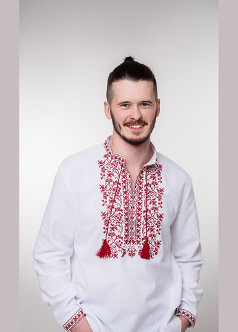 Рубашка из натуральной ткани украшена орнаментом, вышитым крестиком. Узор расположен спереди рубашки, на ячейке-стойке и манжетах. Модель имеет удобные завязки-кисти. Свободный крой не ограничивает движения и садится на любой тип мужской фигуры. Вышиванка универсальна благодаря одной небольшой детали – патику, который позволяет закрепить длинный рукав, превратив его в короткий.