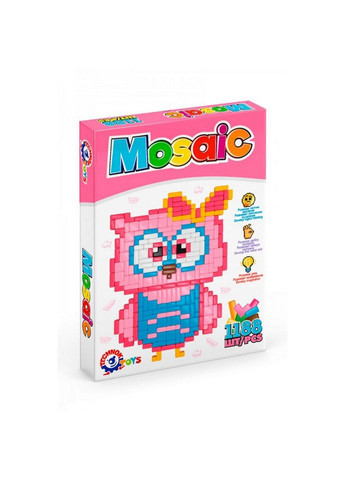 Как собрать мозаику? Рисунок выкладывается на пластиковое поле мелкими фишками различных форм. Всего в комплекте 1188 элементов девяти цветов! Размер самого маленького квадратика 4х4 мм. В помощь детям есть специальный инструмент, которым удобно извлекать фишки из поля. Для молодых художников в наборе есть инструкция, согласно которой можно собрать милую розовую сову или домик под белым снегом. Собрав рисунки по инструкции, потом можно собирать собственные, которые подскажет фантазия. Игрушка "Мозаика" – это отличная игра для развития мелкой моторики, внимания и памяти. Собирая картинку, нужно рассчитать каждый последующий шаг. Это поможет детям улучшить навыки счета и концентрацию. Упаковка – яркая коробка, в которой удобно хранить все элементы мозаики. В наборе: пластиковое поле, 1188 элементов, инструмент для сборки, инструкция. Для детей от 5 лет.