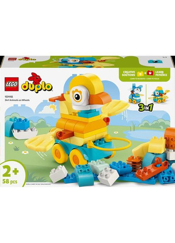 Конструктор LEGO (Лего) DUPLO Town Животные на колесах 3 в 1 предоставляет бесчисленное количество способов насладиться творческой игрой, создавая игрушечную утку, рыбку или собаку или даже совершенно новых животных! Дошкольники, обожающие игрушечные транспортные средства LEGO DUPLO, создают фигурки на колесиках и могут с удовольствием запускать животных мимо или тащить их за собой за ручку.