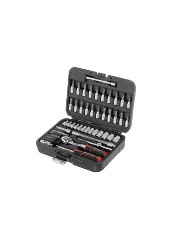 Наборы инструментов INTERTOOL STORM – это новое слово в поддержку качества и многофункциональности! Благодаря своей практичности идеально подходят для автолюбов и домашних мастеров. Инструмент на долгие годы. Все комплектующие сделаны из высококачественных марок стали. Благодаря прочности и современным технологиям производства, инструменты отличаются длительным сроком эксплуатации, устойчивостью к повышенным нагрузкам, а также высокой точностью изготовления. Два слоя никелевого покрытия уберегут от появления ржавчины. Надежная трещоточная ручка. Механизм трещотки и все его комплектующие изготовлены в Тайване, в сочетании с Cr-V сталью – это прочный и надежный инструмент, с мягким ходом храпового механизма. Удобное хранение. Весь инструмент укомплектован в надежный, крепкий кейс с металлическими замками и усиленными петлями. Яркий современный дизайн кейса никого не оставит безразличным! Наборы инструментов No1 в Украине. По результатам независимого рейтингового исследования в рамках проекта Украинская Народная премия 2018, 2019 годов. Торцевые головки и трещотка Механизм трещотки на 72 зубца изготовлен в Тайване. Выделяется плавным ходом храпового механизма, а также прочностью и износостойкостью. Быстрый сброс головок и наличие реверса упростят и во много раз ускорят работу мастера. Трещотка имеет изогнутую ручку для работы в труднодоступных местах. Ручка с резиновой накладкой для максимального захвата не скользит и не выпадает из Ваших рук. Головки туго сидят на посадочном квадрате трещотки 1/4", не спадают и плотно прилегают к поверхности крепления. На каждой головке нанесены насечки для предотвращения скольжения в грязных руках или рукавицах. Кейс Все инструменты упакованы в компактный ударопрочный кейс с надежными металлическими замками. Комплектующие крепко зафиксированы на своих посадочных местах и не выпадают во время транспортировки. Благодаря небольшим габаритам кейса (220*160*60 мм) набор поместится в любом амбаре, бардачке или на полке в гараже. Современный яркий дизайн точно не оставит никого безразличным! Материал изготовления Все инструменты изготовлены из прочной и прочной Cr-V стали. Головки и трещотка Cr-V 50BV30 отличаются длительным сроком эксплуатации, имеют запас прочности и устойчивы к нагрузкам. Двухслойное никелевое покрытие обеспечивает антикоррозионные свойства инструментов. Каждая бита изготовлена из стали Cr-V 6150 с превосходными показателями жесткости и упругости в своем сегменте. Преимущество комплекта Комплектация набора с приводом 1/4" пригодится для выполнения подавляющего большинства работ, связанных с ремонтом оборудования, авто-, мото-, велотехники, а также других работ в быту и гараже каждого домашнего мастера. В комплекте популярны размеры торцевых головок, а также кардан, Т-образный вороток и гибкий удлинитель для откручивания и закручивания креплений в труднодоступных местах. Различные типы бит понадобятся для работы со шлицами, часто используемыми в мебельной промышленности, в приборовке и т.д. Комплектация Трещоточная ручка 1/4", 72 зуба, реверсионная; Головка шестигранная торцевая 1/4", 13 шт. мм; Удлинитель 1/4" 50, 100 мм; Гибкий удлинитель 150 мм; Вороток 115 мм; Кардан 1/4"; Адаптер для шуруповерта 1/4"; Держатель 1/4" для головок и бит 150 мм. Биты: TORX 6 шт: T10, T15, T20, T25, T30, Т40; HEX 6 шт.: 3, 4, 5, 6, 7, 8 мм; PH 3 шт.: PH1, PH2, 