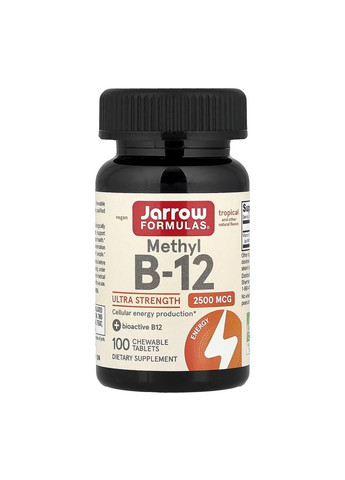 Свойства продукта: Способствует укреплению сердечно-сосудистой системы Поддерживает здоровый цикл сна Способствует расслаблению и засыпанию Поддерживает высокий уровень энергии и жизненного тонуса Поддерживает иммунную систему Поддерживает память Способствует повышению концентрации внимания Поддерживает нормальную работу нервной системы Показания к применению: рассасывать или разжевать по 1 леденцу в день или принимать в соответствии с рекомендациями врача. Что это? Метил в-12 (Метилкобальмин) от Jarrow Formulas – это активный кофермент витамина В-12 со вкусом лимона. Метилкобальмин всасывается и сохраняется лучше, чем другие формы витамин В12, является единственным из водорастворимых витаминов, который способен накапливаться в организме, преимущественно в почках, печени, легких и селезенке. Он поддерживает работу нервной ткани и клеток мозга, способствует улучшению качества сна. Кроме того, вегетарианцы и веганы могут применять этот препарат в качестве дополнительного источника витамина B12. Как это работает? Витамин В12, или метилкобаламин, обеспечивает здоровье сердечно-сосудистой и нервной систем, а также отвечает за нормализацию сна и поддержание энергии во время бодрствования. Этот витамин достаточно мультизадачен – он важен для правильного роста организма, усиливает иммунитет, улучшает аппетит, увеличивает выработку энергии, поддерживает здоровье нервной системы, улучшает память и способность концентрироваться, обладает успокаивающим эффектом, положительно влияет на функцию репродуктивных органов как у женщин, так и у мужчин. Он также участвует в метаболизме жиров и углеводов, усиливает синтез и способность к накоплению белков. При поддержании этого важного витамина на нужном уровне в организме, нормализуется кровяное давление, улучшается работа мозга и нервной системы, улучшается качество сна, а также предупреждается появление депрессии. Элемент Вес Единица Процент Порция 1 леденцы Порций в упаковке 100 Метилкобаламин (метил B12) 1000 мкг 41,670