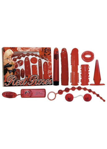 Комплект содержит: - цепочка из 10 анальных шариков (длина - 32 см, диаметр - 0,9-2,4 см); - кольцо для пениса в форме сложенных для поцелуя губ; - рельефная манжета для пениса; - пара любовных шаров (диаметр – 3,5 см); - фаллоимитатор в форме реалистической копии пениса (длина - 18,5 см, диаметр - 2-2,5 см); - насадка на мастурбатор или пенис с шипиками для стимуляции (длина – 14 см, диаметр – 1,5 см, растягивается); - пластиковый мастурбатор с бесступенчатым регулятором (длина – 18 см, диаметр – 2-2,5 см); - анальная пробка (длина – 10 см, диаметр – 1-3 см); - виброяйцо с бесступенчатым регулятором вибрации. Цвет: красный Батарейки входят в комплект.