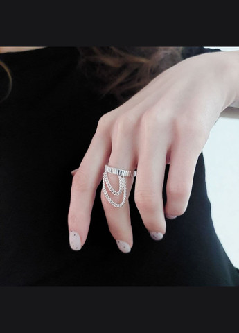 Стильное женское кольцо с цепочками. Покрытие – серебро, на кольце есть проба. Диаметр: 17 мм.