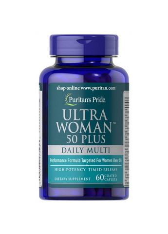 Puritan\ `s Pride Ultra Woman 50 Plus - витамины для женщин старше 50 лет.Всем известно, что после 50 лет женский организм испытывает функциональные изменения, в первую очередь на гормональном фоне. Поэтому женщины старше 50 лет, потребует немного в другом, как в количественном, так и качественном составе питательных веществ, в частности витаминов и минералов.Как принимать:Женщинам после 50 принимать по две (2) капсулы, желательно во время едыСодержание элементов в 1й порции2 каплеты, Витамины, Витамин А (бета-каротин) 3500 МЕ, Витамин C (аскорбиновая кислота) 120 мг, Витамин D (холекальциферол D3) 2000 МЕ, Витамин Е (d-альфа токоферилацетат) 30 МЕ, Витамин К (фитонадион) 10 мкг, Витамин В1 (мононитрат тиамина) 30 мг, Витамин В2 (рибофлавин) 30 мг, Витамин В3 (ниацинамид) 30 мг, Витамин В5 (пантотенат d-кальция) 30 мг, Витамин В6 (гидрохлорид пиридоксина) 30 мг, Витамин В7 (d-биотин) 500 мкг, Витамин В9 (фолиевая кислота) 400 мкг, Витамин B12 (цианокобаламин) 30 мкг, Минералы, Кальций (карбонат кальция, дикальций фосфат и цитрат кальция) 522 мг, Йод (йодид калия) 150 мкг, Магний (оксид магния) 100 мг, Цинк (оксид цинка) 15 мг, Селен (селенат натрия) 100 мкг, Медь (оксид меди) 2 мг, Марганец (глюконат марганца) 2 мг, Хром (пиколинат хрома) 200 мкг, Молибден (молибдат натрия) 75 мкг, Калий (хлорид калия) 30 мг, Ванадий (метаванадат натрия) 10 мкг, UW50 + Биоактивная смесь 50 мг, Цитрусовые биофлавоноиды (Citrus spp.) (Фрукты), экстракт моркови, брокколи (экстракт, экстракт виноградных косточек (Vitis (vinifera)), черная смородина (Ribes (nigrum) (фрукты), экстракт черники (Vaccinium myrtillus) (фрукты), ( Бузина (Sambucusnigra), альфа (липоевая кислота, (ресвератрол (Polygonum cuspidatum) (корень), коэнзим Q-10, ликопин, (лютеин, экстракт сосновой коры) (Pinus (pinaster), UW50 + травяная смесь 50 мг, Трава ячменя (Hordeum vulgare) (воздушная), экстракт дикого ямса (Dioscorea (villosa) (корень), ромашка (Matricaria (recutita) (цветок), клюква (Vaccinium macrocarpon) (фрукты), (Vitex Chasteberry (Vitex agnus- (castus) (фрукты), Dong Quai (Angelica (sinensis) (корень), красная малина (Rubus idaeus) (листья), красный клевер (Trifolium pratense) (цветок), UW50 + смесь коллагена 50 мг, Коллаген (в виде гидролизованного желатина), диоксид кремния, инозитол, битартрат холина, Ингредиенты, растительная целлюлоза. Содержит меньше 2%: силиката кальция, натуральной глазури из пальмовых листьев, ванилина, растительного стеарата магния, растительной стеариновой кислоты