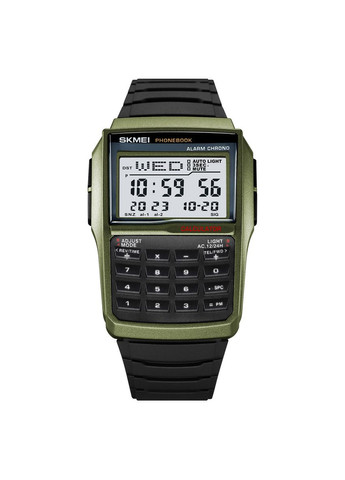 Тип механизма: Электронный; Тип ремешка: Ремешок; Бренд: Skmei; Пол: Мужские; Подсветка: Электролюминесцентная; Функции: Телефонная книжка, Будильник,Календарь, Калькулятор, Секундомер; Стиль: Сasual; Стекло: Полимерное; Ширина: 19; Форма корпуса: Квадратная; Страна производителя: Китай; Материал ремешка: Каучук; Материал корпуса: Полимер; Водонепроницаемость: 30 м; Вес, г: 35; Размеры, мм: 50 х 37,8; Цвет корпуса: Хаки; Индикация: Минуты, Секунды, День недели, Число; Тип циферблата: Электронный; Гарантия: 12 месяцев; Вид циферблата: Арабские цифры; Браслет / Ремешок: Ремешок; Цвет ремешка: Черный; Длина ремешка, см: 25;