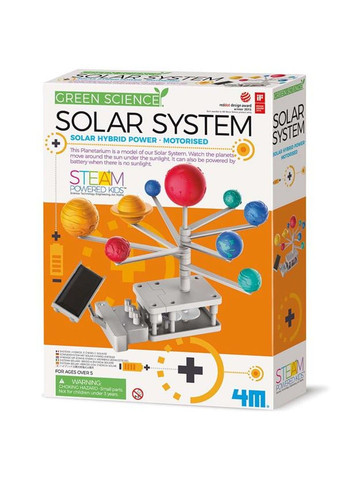 Хотите своими глазами увидеть, как вращаются планеты вокруг Солнца? Для этого не обязательно отправляться в космос! Каждый, кто любит астрономию, отныне может самостоятельно собрать модель солнечной системы с движущимися планетами. К тому же мотор работает как от батарейки AAA, так и от солнечного света. Этот развивающий набор из серии Green Science познакомит детей с альтернативными источниками энергии. Когда свет попадает на панель солнечной батареи, он преобразуется в электричество, которое принуждает мотор работать. По такому же принципу устроены некоторые мелкие приборы у вас дома, например часы и калькуляторы. Настоящая бытовая магия! Соберите модель по инструкции. Все необходимые инструменты и детали кроме батарейки есть в наборе. Установите переключатель питания в положение «солнечная батарея» и поместите модель солнечной системы таким образом, чтобы на нее попадало максимальное количество света. Когда батарея зарядится, вы увидите, как планеты начнут вращаться вокруг Солнца. Если света недостаточно, используйте питание от батарейки. Набор для исследований от 4М дарит детям знания по астрономии, развивает пространственное мышление, навыки конструирования, изобретательность. Он подходит детям от 8 лет для использования по методике STEAM. В этом образовательном подходе дети знакомятся с разными дисциплинами: математикой, механикой, физикой, проектированием, искусством. Методика развивает творческое мышление, навыки конструирования и командной работы. В наборе: Пластиковая рамка с 6 полушариями – 2 шт. Пластиковая рамка с 4 полушариями – 2 шт. Вот – 1 шт. шт. Крепление для солнечной батареи – 1 шт. Проволока – 2 шт. Крышка для батарейного отсека – 1 шт. Опорный рычаг – 1 шт. Мотор – 1 шт. Крышка мотора – 1 шт.