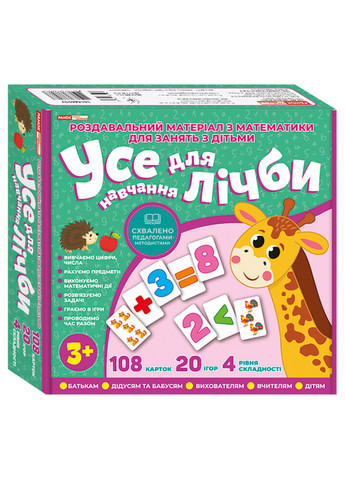 Новинка! 20 игр в 1 наборе! Большой набор с раздаточным материалом по математике! 4 уровня сложности! Это руководство превращает обучение в интересную игру. Ребенок с легкостью и охотой изучит цифры, числа, научится прибавлять, вычитать, сравнивать, считать! Раздаточные материалы созданы по уникальной методике, облегчающей процесс обучения в несколько раз! Рекомендован набор для обучения от 3-х лет, дошкольников и школьников начальных классов. Раздаточный материал по обучению цифр – это надежный помощник для родителей, воспитателей и учителей! Набор содержит задачи 4 уровня сложности, от простого к сложному, поэтому этот набор пригодится для обучения математике детей в возрасте от 3-х лет. Каждый ребенок особенный, имеет свой характер и разные наклонности, и свой темп развития, поэтому важно именно для него подобрать тот уровень сложности, который соответствует его возрасту и способностям. Как работать максимально эффективно с учебным пособием? Очень просто – используем методические рекомендации, где каждый шаг, каждая задача подробно описана и разъяснена. Кроме этого, там множество полезных советов для родителей. В наборе содержится 108 учебных карт и 20 игр с разными задачами! И несколько из них 100% станут любимыми для ребенка. С этим набором ваш малыш: будет расширять кругозор, обогащать лексический запас будет расширять мелкую моторику и логическое мышление; научится моделировать игровую ситуацию, принимать обдуманные решения, спокойно воспринимать поражение; улучшит память и наблюдательность; будет развивать усидчивость, внимание, логическое мышление; будут замечать сходства и расхождения; будет совершенствовать навыки общения со взрослыми и сверстниками. Рекомендовано: родителям, дедушкам и бабушкам, воспитателям, учителям, детям