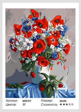 Картины по номерам домашний букет 40х50 Картины по цифрам на холсте Полевые цветы Роспись по номерам Rainbow Art GX42157 (сложность 3, количество цветов 22) цветы, букет, тюльпаны, стол, беседка Картины по номерам — твой путь художника! Рисовать может каждый, а с картинами по номерам – это интересно и увлекательно! У Вас получится создать авторский шедевр своими руками даже если будете работать с холстом и красками впервые. Увлекательные наборы рисования по номерам благоприятно влияют на настроение, творческое развитие и дарят приятный результат – личный шедевр на стену в интерьер или как подарок hand-made. Раскрашивать оригинальные сюжеты на холсте акриловыми красками – удовольствие и радость! Техника настолько проста и ясна, что и дети, и взрослые способны создать свою картину. В каждом сегменте на холсте указана цифра и художнику необходимо окрашивать все сегменты красками с соответствующими цифрами. В результате получаете шедевр, созданный своими руками! Готовая раскраска похожа на работу настоящего художника, ведь никто не узнает, что под краской были цифры и контуры. Как рисовать картину по номерам Наши клиенты используют несколько способов раскраски картин. Советуем испытать их самостоятельно и определить самый лучший для себя! Все сегменты одного цвета. Открываете краску с №1 и раскрашиваете все сектора с таким номером. Затем выбираете следующий номер и окрашиваете все сектора с этим же номером и так далее. Не обязательно использовать их по порядку, можно брать больше нравится или тот, что предусмотрен для соседнего с уже окрашенным сегментом. В этом случае результат может быть не понят почти до последней краски, но очень весело наблюдать, как появляется картина :) От темных оттенков до светлых. Это похоже на первый вариант. Темные, например, коричневые и зеленые цвета, прекрасно ложатся на художественное полотно, хорошо видны их границы и перекрывают линии контуров. Благодаря этому очень удобно зарисовывать соседние более светлые элементы. Обратите внимание, что иногда в наборе есть баночка с черной краской без номера, а на холсте – темно-серые области. Некоторые производители делают их специально, чтобы люди, рисующие по цифрам впервые, могли потренироваться и раскрасить сначала их – хорошо виден весь сегмент и его проще разрисовать. Начинаете с левого верхнего угла и постепенно опускаетесь вниз. Этот вариант подойдет для раскрасок с 4 или 5 уровнем сложности, у которых на схемах много мелких деталей. На протяжении всего процесса рисования появляется очень вдохновляющая картина частями :) Раскрашивание объектами. Выбираете главный объект на картине и раскрашиваете его полностью, применяя первый или второй способ. После чего переходите к следующему объекту и так к концу. Когда вы завершите первый объект, уже будет ясно, как должна выглядеть картина. Со следующими действиями вы ее дополняете. Более всего такой вариант подходит для картин с людьми, животными, букетами. Этот способ больше похож на написание настоящей картины художником. [ Выбор нашего магазина! Рекомендуем раскрашивать так! ] От больших сегментов до мелких. Хотите быстро раскрасить картину? Попробуйте этот вариант! Большие сектора требуют меньше времени и концентрации. Чтобы их зарисовать, понадобится несколько дней. А потом сможете тщательно наводить тонкие 