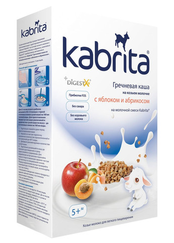 Молочная каша на козьем молоке Kabrita (Кабрита) Гречневая с яблоком и абрикосом - полезный злаковый прикорм для вашего малыша. Каши Kabrita - единственные каши на основе козьего молока на адаптированной молочной смеси без добавлений цельного молока. Характеристики Приготовление: При кормлении из бутылки – для 5-месячного малыша возьмите 40 г (четыре с верхом столовые ложки сухой каши) на 160 мл теплой воды. При кормлении из тарелочки для приготовления более густой каши увеличивайте количество сухой каши по вкусу – к 5 столовым ложкам на 170 мл теплой води. Вымыть руки перед приготовлением каши. Закипятить 160 мл воды и охладить к 40° С . Налить воду в чистую посуду. Прибавить рекомендованное количество сухой каши. Тщательно размешайте кашу до однородности. Для кормления из бутылки перелейте кашу в чистую бутылку со специальной соской. Перед кормлением всегда проверяйте температуру готовой каши. Используйте чистую ложку. Начинайте введение нового продукта с одной чайной ложки, постепенно увеличивая порцию. Не оставляйте остатки каши для следующего кормления. Открытую упаковку хранить не более месяца. Производитель: Kabrita, Нидерланды. Рекомендовано для малышей от 5 месяцев.