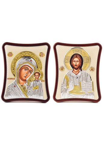 Венчальная Пара Серебряных Икон Иисуса Христа и Казанская Божья Матерь 15x20см с позолоченным фоном Иконы сделаны в Греции на иконописной фабрике Silver Axion Материал серебряного оклада сделан из специального комбинированного листа металла, который сверху ламинирован слоем серебра 999 пробы, также для защиты на поверхность наносится родиевое покрытие, которое защищает серебро от потемнения и "старения" Упаковка: Иконы Упакован в Оригинальную картонную коробочку с логотипом и мешочек Размер одной иконы по внешнему краю - 15x20см