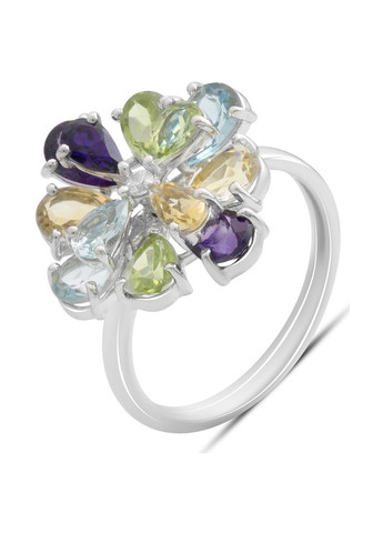 Кольцо 925 пробы с натуральным аметистом 4.128ct, цитрином, хризолітом, топазом. Вес украшения 3,89 г. Физический размер изделия (высота*ширина): 15х15 мм. Страна происхождения: Индия. Вид покрытия: родий. Родированные украшения дольше сохраняют свое первоначальное состояние, а именно цвет и блеск металла. Все ювелирные изделия представленные на нашем сайте прошли внутренний контроль качества, а также контроль государственной пробирной службой Украины, на всех изделиях стоит соответствующая проба. К каждому ювелирному украшению прилагаются бирка с указанием всех параметров. Цвета изделий на сайте могут незначительно отличаться от реальных из-за особенностей цветопередачи экрана.