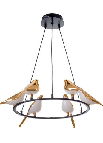 Светодиодная люстра BL-999S/6 30W G/BK это современный светильник золотистого цвета с необычным оригинальным дизайном. Модель подойдет для спальни, гостиной, прихожей или кухни. Высота светильника составляет 1500 мм, ширина 650 мм. Люстра представляет собой золотое кольцо-обруч, расположенное горизонтально, держащееся на тонких подвесах, выходящих из основания светильника черного цвета. На обруче расположены шесть хрупких и элегантных декоративных птиц, внутри которых находятся встроенные светодиоды общей мощностью 30 Вт, излучающие теплый белый свет. Диоды генерируют световой поток с отдачей 80 лм/Вт. ЛЕД источники очень экономны и имеют длительный срок эксплуатации. Люстра создает световой поток с высоким индексом цветопередачи (80Ra). Степень защиты корпуса от попадания внутрь пыли и влаги IP20. Предназначена для использования в сети переменного тока с номинальным напряжением 220 В. К потолку фиксируется с помощью монтажной планки. Дизайн люстры делает модель подходящей для интерьеров, оформленных в разных стилях.