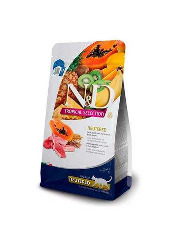Низкозерновой сухой корм для кастрированных или стерилизованных котов и кошек Farmina N&D Tropical Selection Cat Neutered Представленная линейка кормов Farmina разработана с участием ведущих специалистов и ученых Италии, главная задача которых полягала в том, чтобы создать не просто питательный, но и сбалансированный рацион, помогающий сохранять здоровье любимых питомцев. Все в этом корме идеально, начиная от размера гранул и заканчивая их содержимым, порадуйте верного друга этим лакомством, и Вы увидите положительные изменения, как во внешнем виде мурлыки, так и в ее поведении. N&D Tropical selection — это новая линия кормов, разработанная специалистами Farmina, особенностью которой является наличие разнообразных тропических фруктов в составе. Лучший корм для взрослых кошек содержит 90% белков животного происхождения, анцестральные злаки (спельта и овес) с низким гликемическим индексом и тропические фрукты: папайя, манго, киви, ананас и банан. Эти фрукты богаты природными антиоксидантами и полными витаминов. Гипоаллергенные корма для кошек холистик предназначены для взрослых питомцев старше 12 месяцев для полнорационного сбалансированного питания и предотвращения развития проблем с пищевой непереносимостью и пищеварением. И если Купить сухой корм для взрослых кастрированных котов Ягненок считается хорошим источником животного белка и гипоаллергенным компонентом, поэтому корм с мясом ягненка предпочитают давать животным с чувствительным пищеварением или аллергией на мясо птицы. Овес - источник высокоперетравливаемых углеводов, белка и питательной клетчатки. Отличается низким гликемическим индексом (40), поэтому полезен для диабетиков, пожилых и питомцев с аллергией. Спельта - злаковая культура, но по сравнению с птицей зерна спельты содержат больше белка (от 27% до 37%), железа и витаминов группы В, а также меньше глютена, который часто вызывает у животных аллергию. Горох является отличным заменителем злаков, так как имеет более низкий гликемический индекс, это качественный источник растительного белка, углеводов и клетчатки. Клетчатка свекловочного жема обеспечивает источником энергии, который может улучшить здоровье толстой кишки, наряду с увеличением массы и влаги стула животного. Рыбий жир является источником энергии и Омега-3 жирных кислот, в том числе ДГК (докозагексаеновой кислоты) и ЭПК (эйкозапентаеновой кислоты), для поддержания здоровой кожи и шерсти. Экстракт дрожжей содержит витамины, ферменты и маннановые олигосахариды – пребиотики, которые поддерживают здоровую, сбалансированную микрофлору кишечника, а также бета-глюкан – полисахариды, стимулирующие иммунитет. Тропические фрукты обогащают состав корма витаминно-минеральным комплексом, и добавляют в привычный рацион новый вкус, который заинтересует даже самых требовательных гурманов! Аналитический состав корма Компонент Содержание протеин 31,01% жир 11,01% зола 8,51% клетчатка 6,51% кальций 1,11% фосфор 0,91% магний 0,09% Омега-3 0,41% Омега-6 2,01% Состав корма для кошек Фармина баранина (20%), дегидратированный белок ягненка (20%), спельта (12%), овес (12%), сушеный свеклый жем, обезвоженный белок сельди, мука люцерны, сушеные яйца, куриный жир, рыбий жир (из сельдеца), сушеная морковь, инулин, фруктоолигосахариды, дрожжевой экстракт (источник маннанолигосахаридов), сушеный банан (0,5%), сушеный киви (0,5%), сушены