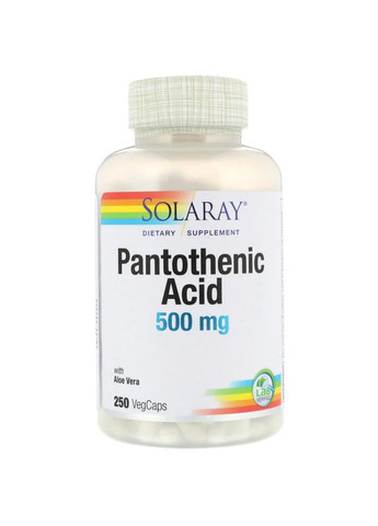 Свойства продукта: Поддерживает высокий уровень энергии и жизненного тонуса Поддерживает иммунную систему Поддерживает здоровье слизистых оболочек Способствует контролю веса Показания к применению Принимать 1 таблетку в день, желательно во время еды, или по рекомендации специалиста. Что это? Пантотеновая кислота (витамин B5) является членом семейства витаминов B-комплекса и содержится почти в каждой живой клетке в качестве компонента коэнзима A (CoA). CoA необходим для выработки энергии из жира, углеводов и белков. Таким образом, главная задача витамин В5 - производство клеточной энергии. Как это работает? Основная роль пантотеновой кислоты - участие в клеточном процессе производства энергии. Витамин В5 запускает процесс липолиза - высвобождение и сжигание жиров. Таким образом вырабатывается дополнительная энергия, которая нужна организму при повышенной умственной и физической нагрузках. Также пантотеновая кислота является противовоспалительным веществом и мощным защитником иммунной системы. Она помогает вырабатывать антитела, а также защищать все слизистые оболочки организма от инфекций. Противовоспалительное действия витамина В5 обусловлено его деятельностью в коре надпочечников, где он синтезирует глюкокортикоиды. Они, в свою очередь, защищают организм от негативных реакций на чужеродные микроорганизмы. Показания к применению Принимать 1 таблетку в день, желательно во время еды, или по рекомендации специалиста. Элемент Вес Единица Процент* Порция 1 таблетка Порций в упаковке 250 Пантотеновая кислота (в виде D-пантотената кальция) 250 мг 5,000% * Процентные суточные значения основаны на диете на 2000 калорий