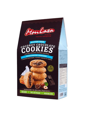 Нежное душистое печенье из кокосовой и рисовой муки с начинкой из шоколада с фундуком на кокосовом масле с добавлением натурального меда. Не содержит глютен. Только растительные ингредиенты и натуральный мед. Особенности: Без глютена, искусственных добавок и консервантов Питательный и вкусный перекус в любое время дня Подходит для тех, кто придерживается здорового образа жизни. 1.1г), углеводы – 29.5г (из них добавлен сахар – 0г, сахара природные – 25.6г), соль – 0.3г. Энергетическая/пищевая ценность: 1235 кДж/295 ккал. 100% натуральное Без добавления сахара