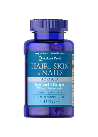 Puritan\ `s Pride Hair Skin and Nails Formula Type 1 and 3 Collagen представляет собой широкий спектр витаминов, минералов, растительных экстрактов, а также коллаген 1 и 3-го типов. Формула содержит дозировки, необходимые для поддержки здоровья и красоты вашей кожи, волос и ногтей.Коллаген - основной структурный белок, необходимый для нормального функционирования и роста тканей. Его регулярное применение курсами 2 раза в год сделает ваши кожу, волосы, ногти крепкими, нормализует рост и регенерацию. Кожа станет более упругой, эластичной, упругой.Как принимать:Принимать 3 таблетки в день вместе с едойСодержание элементов в 1й порции3 каплеты, Витамины, Витамин А (ретинилпальмитат) 5000 МЕ, Витамин C (аскорбиновая кислота) 60 мг, Витамин D (холекальциферол) 1000 МЕ, Витамин Е ( d-альфа токоферилацетат) 15 МЕ, Витамин В1 (гидрохлорида тиамина) 5 мг, Витамин В2 (рибофлавин) 2 мг, Витамин В3 (ниацинамид) 25 мг, Витамин В4 (холина битартрат) 10 мг, Витамин В5 (пантотенат d-кальция) 15 мг, Витамин B6 (гидрохлорид пиридоксина) 5 мг, Витамин В7 (d-биотин) 3 мг, Витамин В8 (инозитол) 30 мг, Витамин В9 (фолиевая кислота) 200 мкг, Витамин В10 (пара-аминобензойная кислота) 10 мг, Витамин B12 (цианокобаламин) 8 мкг, Минералы, Кальций (карбонат кальция и фосфат дикальция) 200 мг, Фосфор (фосфат дикальция) 90 мг, Магний (оксид магния) 50 мг, Цинк (глюконат цинка) 7,5 мг, Марганец (глюконат марганца) 2 мг, Цитрусовые биофлавоноиды / комплекс рутина 38 мг, Порошок хвоща (Equisetum arvense) (воздушный) 3 мг, Коллаген гидролизованный 50 мг, Ингредиенты, растительная целлюлоза. Содержит меньше 2%: желатина, натуральной глазури из пальмовых листьев, кремнезема, растительного стеарата магния