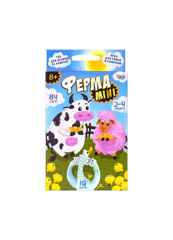 Ферма мини-простая и веселая игра для семьи и компании! Цель игры-первым собрать свою мини-ферму, в которой есть каждый вид карт-животных.Для этого покупайте карты, составляя простые равенства с добавлением или вычитанием.Леса, волк и медведь могут украсть животных из фермы, а фермер со сторожевой собакой помогут победить . Учитесь считать играя и просто весело проводите время с близкими. В наборе 84 карты. Количество игроком: 2-4 чел. Размер упаковки: 13,5х9х2,5 см. Возраст 8+ Характеристики: Вес товара: 0,2 Габариты: длина: 13,5 Габариты: ширина: 9 Габариты: высота: 2,5 Состояние: новое Возрастная группа: От 8 лет Языки: Украинский Ширина: 9 Высота: 2,5 Длина: 13,5 Материал: картон Тип: Настольная игра Цвет: Разные цвета Упаковка: Картонная коробка Вид: Развлекательные Назначение: Для всей семьи Возраст: От 8 лет Жанр: Развлекательные Гарантия: 14 дней Пол: унисекс Время игры: от 15 мин. Количество игроков: 2-4 Страна регистрации бренда: Украина Страна-производитель товара: Украина Количество деталей: 84 Вес: 0,2