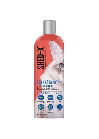 100% натуральная комплексная ежедневная витаминная добавка для кошек. Гарантирует при правильном применении через 3-6 недель уменьшение сезонной и несезонной линьки и улучшение качества шерсти. Состав, разработанный с участием специалистов в области питания животных, включает оптимальное соотношение жирных кислот Омега-3 и Омега-6 (5:1), витаминов и минералов, необходимых для лечения, улучшения и поддержания оптимального состояния шерсти и кожи кошек. Кроме того, Shed-X Cat имеет отличный вкус, который так любят кошки. Почему стоит купить витаминную добавку для шерсти кошек SynergyLabs Shed-X Cat: уменьшает линьку, улучшает качество шерсти; содержит антиоксиданты, которые помогают бороться со свободными радикалами; может замедлить процесс старения и продлить жизнь вашему питомцу; снижает риск сердечно-сосудистых заболеваний; укрепляет иммунитет; Омега-3 и 6 жирные кислоты - незаменимые жиры, которые животные получают только из корма, так как организм не может их синтезировать. Содействуют здоровью кожи и шерсти, положительно влияют на функцию мозга (особенно связанную с возрастом) и нервную систему, защищают от болезней сердца, диабета, важно, что Shed-X Cat содержит оптимальное соотношение этих жирных кислот 5:1; /li> линоленовая кислота Омега-3 (рыбий жир из норвежских анчоусов и сардин, масло из семян льна) помогает сохранить естественную влажность кожи и улучшить качество шерсти, уменьшить ломкость, усиливает иммунную систему организма, способствует процессам регенерации; линолевая кислота Омега-6 (растительное масло, масло зародышей пшеницы) восстанавливает эпидермальный слой кожи, способствует уменьшению зуда и шелушения; цинк - незаменимый микроэлемент для густой и здоровой шерсти, укрепление иммунной системы, помогающей при лечении кожных заболеваний (псориаз, экзема, акне и др.); витамин Е стимулирует кровообращение, что, в свою очередь, способствует сильному и здоровому росту шерсти, богатый антиоксидантами витамином для общего здоровья. Помогает улучшить состояние тусклой, сухой и безжизненной шерсти; витамин А – – помогает улучшить зрение, предотвратить рак, защитить сердце и укрепить иммунную систему. Используется при лечении кожных заболеваний (акне, экзема, солнечные ожоги, шелушение кожи, язвы, горячие точки, псориаз и др.), помогает повысить и восстановить качество кожи и шерсти; витамин B6 (пиридоксин) укрепляет кожу и шерсть, предотвращает возникновение кожных заболеваний (дерматитов, воспалений). Играет важную роль в превращении пищи в энергию, помогает организму усваивать жиры и белки; инозитол способствует увлажнению кожи и шерсти; биотин помогает поддерживать здоровье кожи, нервов и пищеварительной системы, укрепляет шерсть, снижая ее выпадение; экстракт розмарина – натуральный антиоксидант, который сохраняет свежесть жирных кислот, оказывает приятный вкус, оказывает тонизирующее действие на кровеносную и нервную системы. Ленение для кошек - это естественный, обычно сезонный процесс. Однако при чрезмерном выпадении шерсти, появлении признаков раздражения кожи, сухости и ломкости шерсти и т.д. рекомендуется обратиться к ветеринару для определения причин: гормональный дисбаланс, лекарственные препараты, укусы блох и клещей, чесотки, дерматит, стригущий лишай, иммунные заболевания, болезни печени, почек, пищевая аллер
