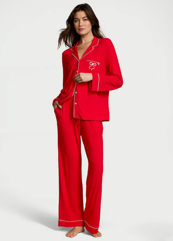 Уютная и стильная пижама станет идеальным выбором для комфортного отдыха и сна. Комплект состоит из классической рубашки прямого кроя и длинных брюк. Рубашка имеет длинные рукава, откладной воротник, застежку на пуговицы и накладной карман с декоративной вышивкой. Контрастная окантовка по краям придает образу элегантности и утонченности.
